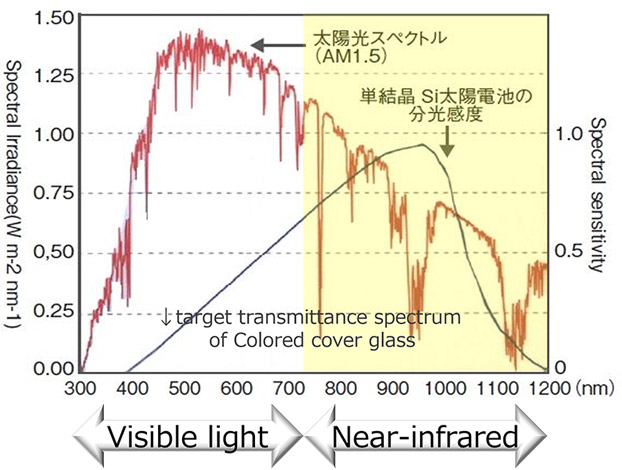 Fig. 1-1 シリコンセルのスペクトル応答と光スペクトルの比較基本的な製品構成をFig. 1-2に示す。屋外面から順に、高透過ガラス、着色層、接着樹脂、発電層(Si)、黒色バックパネルで構成される。この構成では、最表層に高透過ガラスを配置し、その内側に意匠コートを施すことで、高い耐擦傷性とガラスの質感を生かした意匠性を両立できる。特に、高透過ガラスは光の透過を妨げず、発電効率を維持しつつ、美観を保つ役割を果たす。