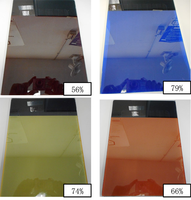 (塗膜なしを100 %とする)。左上:赤、右上:青、左下:黄色、右下:赤/白配合