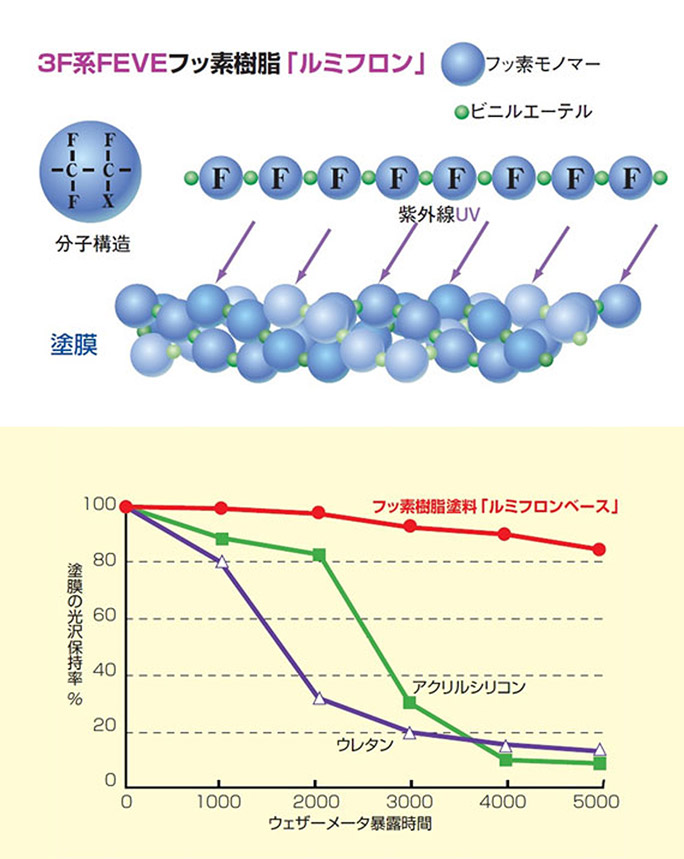 Fig. 1-3 ルミフロン®の構造(上)と耐光性(下)AGC化学品カンパニーHPより