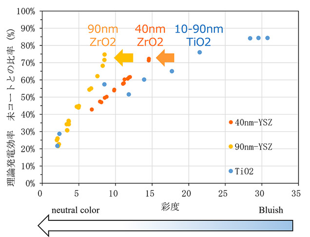 スペクトル曲線の傾斜が急である場合、可視光と赤外線の透過率の差が大きくなる。つまり、赤外域は透過し発電に用いられ、一方で可視光は広範な波長で散乱、反射され、白色の外観を与えることができる。ただし、可視光スペクトルの傾斜が急であるほど発電効率は向上するものの、短波長側が相対的に強く散乱されることになるため、青みがかった外観となる。通常壁材ではよりニュートラルな白色が要求されるため、要求される発電効率と色調に応じ粒子径を選択することが重要である。