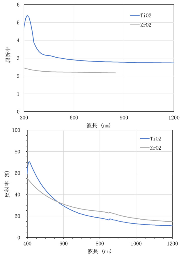 顔料の粒子サイズに加え、屈折率の波長依存性も色調に大きな影響を与える。Fig. 3-3は、チタニアナノ粒子を用いた場合の発電効率と彩度の相関を示している。Fig. 3-4は塗膜セルの外観である。異なる顔料を使用した場合、同じ発電効率でも彩度に大きな差が現れた。Fig. 3-5に示すチタニア、ジルコニア顔料粉体の屈折率、反射率の波長依存性をみると、ナノサイズのチタニアはバンドギャップ領域において屈折率が顕著に増加しており、この屈折率の増加が青み(高彩度)の原因であることが推察される。この特定の屈折率ピークはナノサイズのチタニアに特有のものであり、より大きな粒子サイズのチタニアでは見られない。チタニアは白色顔料として汎用的に用いられる組成であるが、ナノサイズ顔料を扱う本系においてはジルコニアが好適であった。