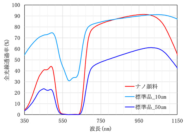 Fig. 3-6は、それぞれ標準サイズのチタニア顔料と、ナノ顔料を配合した塗膜の分光スペクトルを示す。標準顔料の粒子径は800 nm、ナノ顔料の粒子径は30 nmである。標準顔料において、膜厚10 μmでは全体的に高い透過率を示すものの、可視光域での透過率が高いため十分な発色が得られず、また隠ぺい性も不足している。一方、膜厚を50 μmまで厚くすると可視光域の透過率が低く、隠ぺい性に優れるが、長波長域において透過率の低下が見られる。これに対しナノサイズ顔料を使用した塗膜では、可視光域での透過率を十分に低下させつつ、赤外波長域の透過率を高く維持することができた。ナノサイズ顔料では、通常の顔料に比べ光の散乱が抑制され、顔料の吸収のみ現れるため、このような高い波長選択性が発現するものと考えられる。