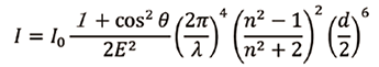 I:散乱強度、I0:入射光強度、θ:散乱角、R:粒子までの距離、n:屈折率、d:粒子半径