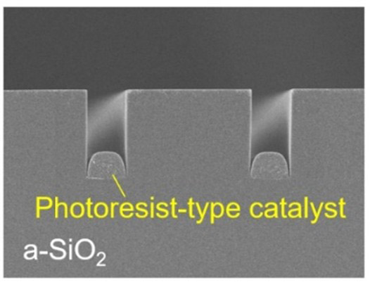 我々は、ノボラック型フォトレジストに含まれる親水性官能基が、高温環境下でHFガスとa-SiO2との反応の触媒として機能することを見出した19。この現象は、a-SiO2基板上のフォトレジストで覆われた部分が選択的にエッチングされる(Fig. 1)。これにより、従来のICP-RIEでは必須のハードマスク材料およびプラズマ源を用いることなく、垂直異方性エッチングを可能とした。また、通常のRIEと比べて約3倍の加工速度が得られるため、次世代のa-SiO2デバイスの製造における実用化プロセスとなることが期待される。