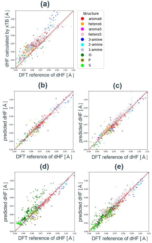 特徴量の設計には、xTBを用いて最適化した構造の電荷分布、結合長、エネルギーの値を用いた。はじめに、xTBを用いた構造最適化でdHFを計算し、DFT計算を用いた参照dHFとの比較を行った。xTBで計算したdHFは、DFT計算と比較して0.005 Å程度過大評価するが、0.98 Å以下の短いdHF領域では線形に相関していることが分かる(Fig. 11a)。一方で長いdHF領域では最大0.02 Å過大評価し、傾向が異なることが分かった。この値をHFs_xTBという特徴量に定義し、単回帰分析を実行したところ、R2は0.71であった。そこで、全体的なばらつきや、特に長いdHF領域の異なる傾向を補正するため、追加の特徴量設計を行った。