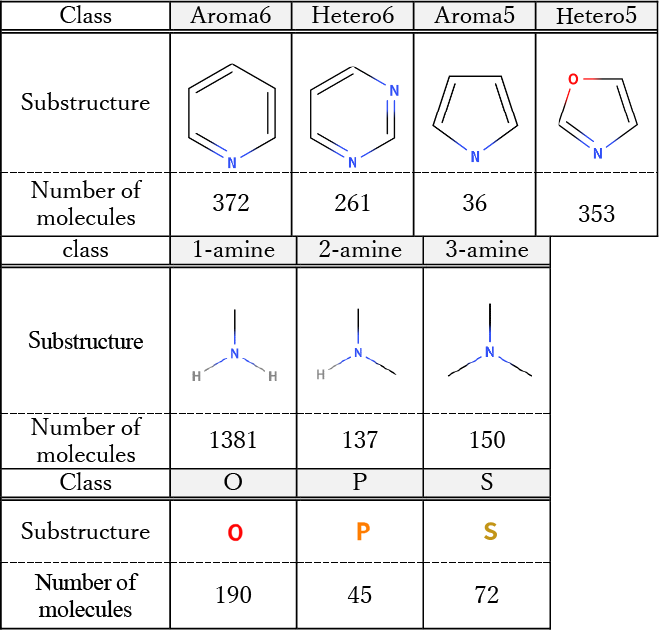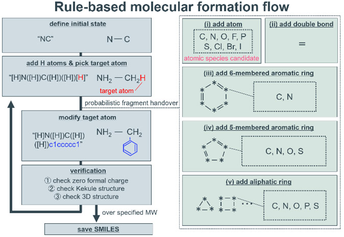 本研究の場合、探索の対象は比較的明確であり、窒素、酸素、リン、硫黄などの塩基性吸着サイトを含み、その近傍に多様な部分構造を有する有機分子である。また、得られた触媒候補は将来的に産業応用を目的として検証されるため、特殊な構造を有する材料よりも汎用的な材料が望ましい。これらの理由から、汎用的な初期構造をベースに部分構造を改変するルールベースの分子生成プログラムを実装した。実装したプログラムの分子生成フローをFig. 12に示す。