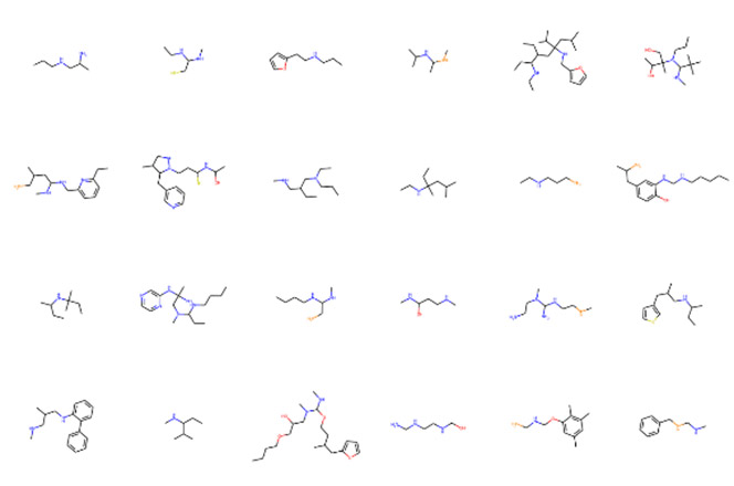 このようにして実装したプログラムはFig. 13に示すように、初期構造を含む多様な分子構造を生成可能であることを確認した。また、特徴量計算や予測の律速にならない十分な速度で分子構造を生成可能であることを確認した。