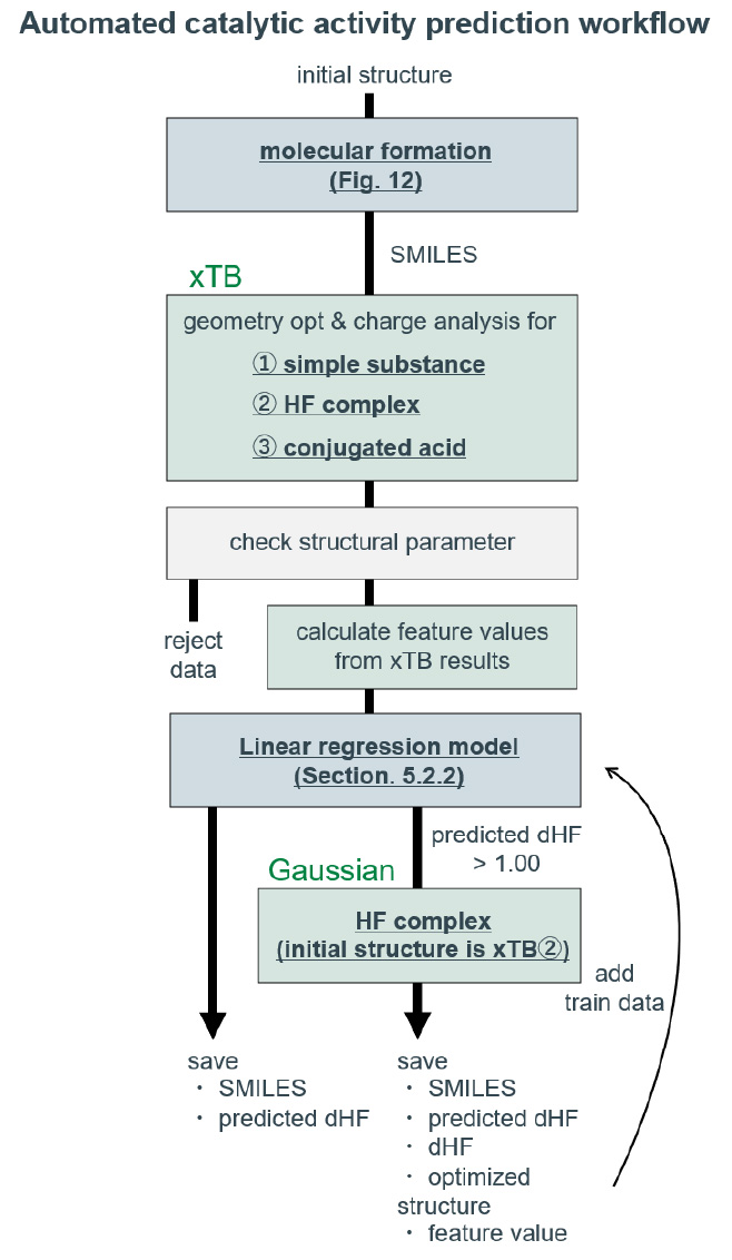 はじめに、分子生成プログラムによって初期構造を含む分子のSMILESを生成する。そのSMILESを読み込み、xTBを用いて特徴量計算に必要な構造最適化と電荷解析を実行する。それぞれの最適化構造が指定の範囲内の結合長やエネルギーを有する場合のみ特徴量計算を行う(Table S3)。特徴量を読み込み、事前に訓練したdHF予測モデルでdHFの予測を実行する。予測したdHFが1.00 Å以上であった場合、DFT計算で再度構造最適化を実行する。DFT計算が実行された分子は、データが保存され、dHF予測モデルの訓練データに加えられる。この追加の訓練は、触媒探索に特に重要な高活性領域や外挿領域の将来的な予測精度向上を図ったものであり、現時点では十分なデータ追加ができていないため、本稿では説明を省略する。このようにして、多様な触媒分子の性能を自動で評価しつつ、モデルの訓練データを逐次追加するワークフローを構築した。