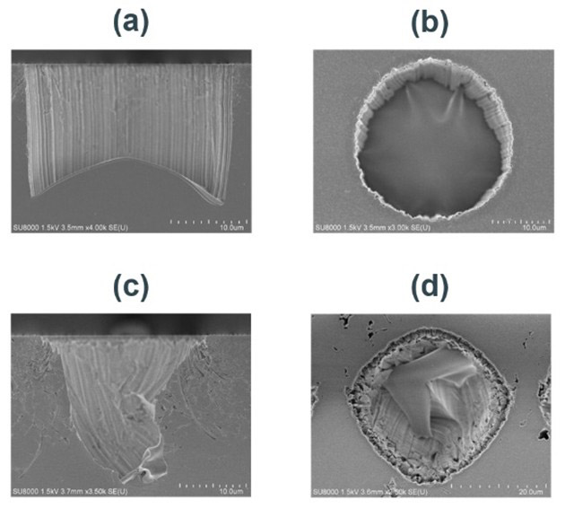 Fig. 15 SEM images after HF gas treatment using (a)(b) novolac resin and (c)(d) PPE as catalyst89.