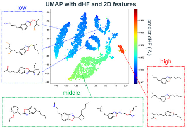 Fig. 18 UMAP based on predicted dHF and 2D features and representative structures of each region.