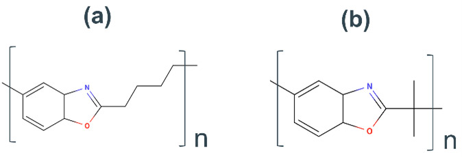 Fig. 19 Example structure of benzoxazole polymers predicted to be highly catalytic activity. Polybenzoxazole with(a) Carbon chain spacers and(b) side chains imparted.7. まとめ