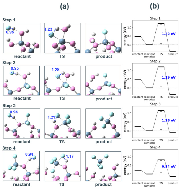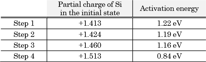 ここで、(SiO2)nはSiO2表面の構造を表し、この段階的な反応で1つのSiO2ユニットが完全にフッ素化されることを示している。各ステップの始状態では、HFはSi-OH基またはSi-O-SiのOに吸着し、安定化する。その後の遷移状態では、HFがSiにさらに近づくことでSi-O…H-Fの4員環が形成され、HFは引き伸ばされる。最終的にHとFは解離し、それぞれOへの移動とFへの求核が完了しSi-F結合が生成される。各ステップのエネルギーダイアグラムをFig. 3bに示す。Step 1が1.22 eVの活性化障壁を持つ律速反応であり、それ以降Fが配位するごとに活性化障壁は下がっていく。これはTable 1に示すように、電気陰性度の高いFがSiに配位するごとにSiの電荷密度が低くなり、新たなHFからの求核攻撃を容易に受けることが理由である。