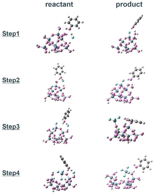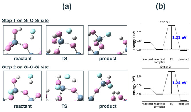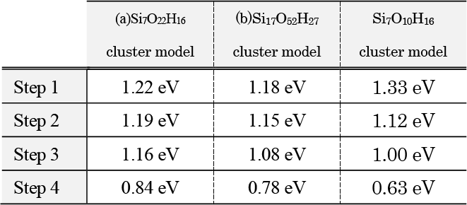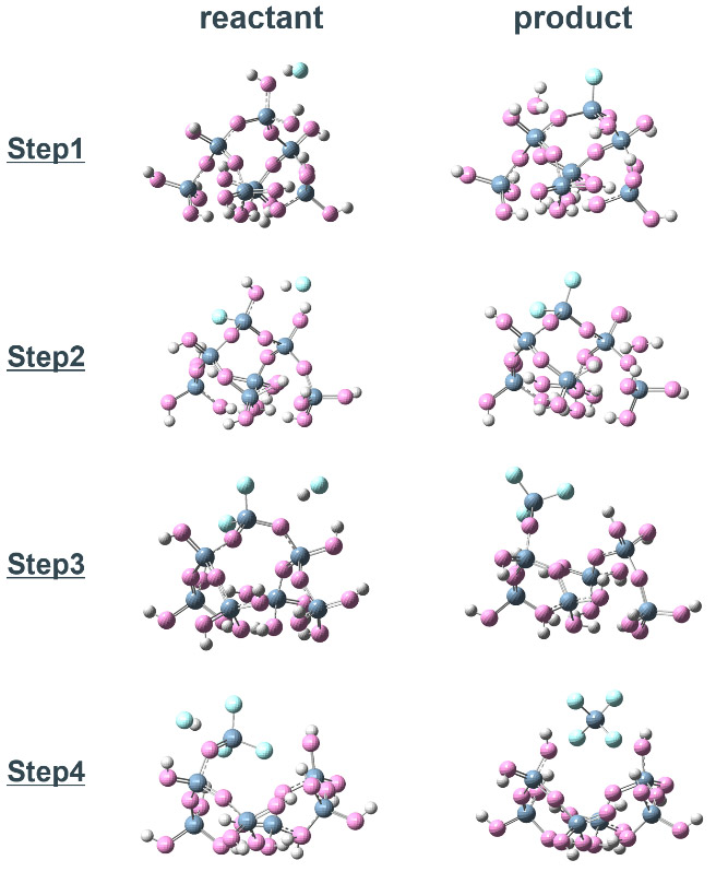 SiO2クラスターモデルからSiF4 1分子が乖離するまで、逐次的に4つのHF分子の反応プロセスを解析した結果を示す(Fig. 3a)。Fig. 4に各反応ステップにおける始状態と終状態の構造を示す。なお、Step 1、2で生成した水分子は次のステップでは系から除外した。