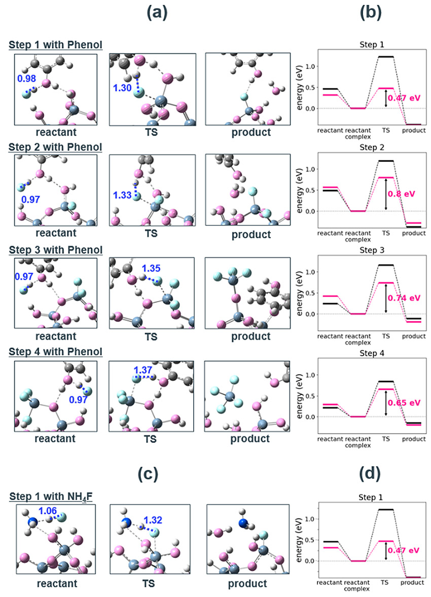 Fig. 5(a) Snapshots, and(b) energy diagrams of the reaction process in each step for SiO2 etching by HF with phenol and (c)(d) step1 with NH4F.