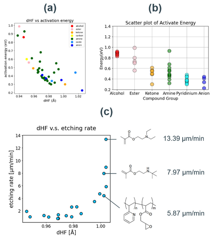 Fig. 7(a) dHF vs. activation barrier plot grouped by catalyst substructures.(b) Distribution of activation barriers for each substructure group.(c) Correlation plot between dHF and experimental etching rate. Molecular structures of highly active catalysts are explicitly illustrated.5. 触媒活性予測手法の構築