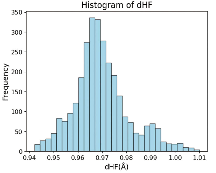 探索の中心となる触媒基は塩基性の高い窒素原子の吸着サイトを持つ化合物である。多様な塩基性分子構造を得るために、SciFinder64から10種の異なる部分構造(Table 3)を有する化合物のSMILES(SimplifiedMolecular Input Line-Entry System)65を取得した。対象の部分構造を含む化合物で、水素、炭素、窒素、酸素、フッ素、リン、硫黄、塩素、臭素、ヨウ素原子のみで構成され、総電荷が中性で、分子量350以下の単一分子を、取扱いサプライヤー数が多い順に各1000種ずつ取得した。次に、RDKit66を用いて、取得した分子の原子毎のGasteiger電荷67, 68を計算し、Gasteiger電荷が最も負に大きい原子を、HFが吸着する原子と定義し、dHFを求めた。吸着サイト原子がTable 3の10種に当てはまらない化合物は候補から除外した。また、吸着サイト原子にHF分子が吸着したとき、フッ素原子側に水素結合が形成されるような分子構造を持つ化合物を候補から除外した。酸性サイトとフッ素原子との間に形成される水素結合は大きな触媒作用を示さないため、本研究では触媒の塩基性吸着サイトによるHF分子の伸長作用のみに着目する(Fig.S7-S9)。最終的に得られた分子データの総数は2997であり、部分構造の内訳をTable 3に示す。分子データセットのd H Fを計算するためには、分子のSMILESから立体構造を生成し、吸着サイト周辺にHF分子を付加し、量子化学計算を用いて構造最適化をする必要がある。そこで、SMILESから2次元構造を生成し、明示的な水素原子を付加したのち、3次元構造を生成した。分子構造ごとに定義した吸着サイト原子に対し、余分な水素原子を一つ付加し、電荷+1eの状態で再度構造最適化を行った。得られた構造に対し、吸着サイト原子から付加した水素原子に向かうベクトルの延長線上に、フッ素原子を、水素原子から1.0 Å離して配置した。この構造を初期構造として、DFT計算による構造最適化を実施した。得られた最適化構造で、HF分子間距離が1.2 Å以上であるものや、吸着サイト原子とHF分子の水素原子との距離が2.5 Å以上であるデータを除外した。また、得られた最適化構造から見積もった候補分子とHF分子との間の相互作用エネルギーが正となった分子は、データセットから除外した。データセットの全ての構造に対して計算したdHFは、0.965 Åを中心とした正規分布状に広がっており、偏りがないことを確認した(Fig. 8)。