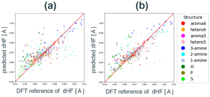 Fig. 9 DFT reference vs. predicted dHF plots for random forest models with different feature sets.(a) RDKit features reduced by Boruta.(b) Mordred features reduced by Boruta.