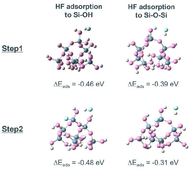 Step 1、Step 2の始状態で、SiO2クラスターモデルの表面にはSi-OH基とSi-O-Siの2つの異なる吸着サイトが存在する。HFの吸着エネルギーはSi-OH基の方が0.1 eV程度安定であり、優先的に吸着することが分かる(Fig. S1)。また、Si-OH基とSi-O-Siのそれぞれの結合を切断する反応の活性化障壁を比較すると、Si-OH基の方が0.1 eV程度活性化障壁が低く、反応が起こりやすい(Fig. S2)。そのため、最初の2つのHFが表面のSi-OH基をSi-F基に置換し、続く2つのHFがバルク側のSi-O-Si結合を切断する、以下の4ステップの反応が優先的に進行すると考えられる。
