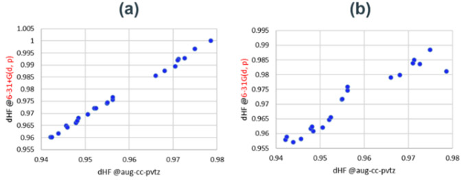 異なる基底関数で、触媒なしのHFエッチングStep1の活性化障壁は最大0.5 eV程度大きく変化することが分かった(Fig. S4)。小さい基底関数では活性化障壁を過小評価し、分極関数やdiffuse関数の追加、TZレベルの展開により改善される傾向がある。これは、HF分子の結合長の評価に起因することが分かった(Fig. S5)。あらゆる結合状態のHFにおいても、大きい基底関数と一貫性のあるHF結合距離を評価可能な最小の基底関数を調査した。汎用な1~3級アミン、エステル、アルコール、オキシド、アニオンを含む23の分子セットで、相互作用したHFの結合距離がaug-cc-pvtz基底と良い相関を示した6-31+G(d, p)基底を採用した(Fig. S6)。diffuse関数を含まない6-31G(d, p)基底では、分子種による過大・過小評価が確認された。