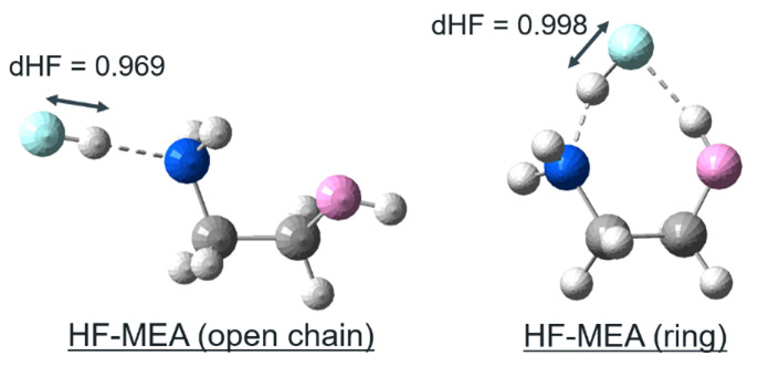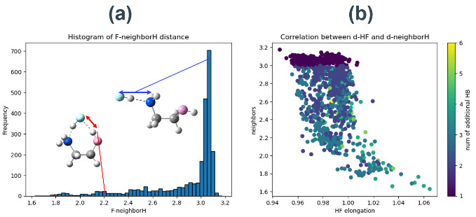 Fig. S9(a) Histograms of distances between fluorine atoms and adjacent hydrogen atoms for the structure-optimized catalyst-HF molecular complexes. As an example, the values for the two MEA in Figure S5 are explicitly shown.(b) Correlation plot between the distance between fluorine atom and adjacent hydrogen atom and dHF. The number of hydrogen atoms within 3 Å of a fluorine atom is color-coded.触媒活性予測ワークフローのデータ採用条件