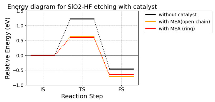 Step 1の反応で比較すると、フェノールがない場合と比べて、始状態のHF結合距離は0.03 Å増加しており、HFの結合が弱まっていることが分かる。HFのFがSiへ接近すると、Si-O…H-O…H-Fの6員環が形成され、遷移状態となる。このとき、フェノールがない場合と比べてHF結合距離は0.07 Å増加している。その後、Fの求核攻撃と同時に、HFとフェノールの水酸基はプロトントランスファー機構によって、Si-Oへのプロトン移動とともにフェノールが再形成される。結果としてFig. 5bに示すように、全てのステップで活性化障壁は低減しており、律速となる障壁が1.22 eVから0.86 eVへ下がっている。これらの結果から、フェノール分子がエッチング反応の触媒として作用していることが分かり、その触媒メカニズムは、始状態から遷移状態に至るまで継続的に形成されるHFと水酸基の水素結合により、強力なHFの結合を弱める機構であることを示している。