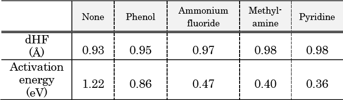 4.2節の結果から、HFとの水素結合が強い触媒基は反応促進効果が大きいという仮説を立てた。その検証のために、水素結合の強さを象徴的に表す指標として、 HFと触媒基が複合体を形成した際のHF結合距離(dHF)を導入した。HFと触媒基が水素結合を形成すると、HFの水素原子は静電相互作用・ファンデルワールス相互作用により触媒基に引き寄せられる。これによりHF間の結合は弱まり、結合長は伸長する。つまり、形成される水素結合強度は、HFの結合距離の増加と相関する。フェノールよりもdHFが大きいと予測されるいくつかの分子について、DFT計算を実施し、律速段階であるStep 1の活性化障壁の大きさを比較した(Table 2)。触媒なしの場合のdHFは、構造最適化した孤立HF分子の結合長とした。触媒がない場合の活性化障壁が1.22 eV、フェノールが触媒作用した場合が0.86 eVであったのに対し、dHFが大きい分子は0.47 eV以下と、より高い触媒効果を発揮していることが分かる。フッ化アンモ二ウムNH4Fを触媒に用いたStep 1の反応過程をFig. 8に示す。フェノールと比較して、始状態と遷移状態でのHF結合距離がより増加していることから、4.2節の触媒メカニズムの考察と合致する。