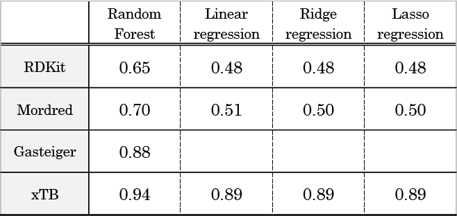 はじめに、汎用的な特徴量セットであるRDKit記述子とMordred記述子73を用いて精度検証を行った。特徴量の総数は45と17であった。評価指標と参照値-予測値プロットをTable 4、 Fig. 9に示す。最も高いR2は、Mordred記述子を用いたランダムフォレストモデルが示した0.70であり予測精度は低い。これは、これらの特徴量セットが分子構造全体の性質を表すことに起因する。例えば重要度が最も高い特徴量はそれぞれBCUT2D_MRHIとnBaseであり、これらは、分子内の原子の最も高い分極率を表す特徴量と、塩基性部分構造の数をカウントする特徴量である。4.3節で説明した通り、dHFは吸着サイト部分の塩基性が重要であるため、局所構造に特化した特徴量を設計する必要がある。