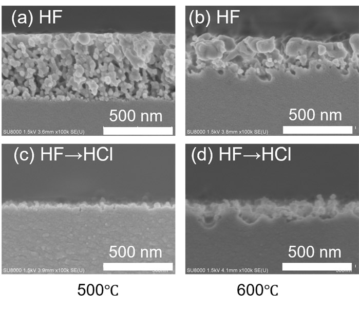 Fig. 10に500 ℃で反応させたサンプルと600 ℃で反応させたサンプルのHF処理後および塩酸処理後の拡大したSEM像を示す。塩酸処理後の表面形状はHF処理で生成されたフッ化物の形状と類似している。この結果はフッ化物とガラスが何らかの反応をしていることを示唆する結果である。そのため、塩酸処理後の形状を制御するためにはフッ化物の形状を制御することが必要である。