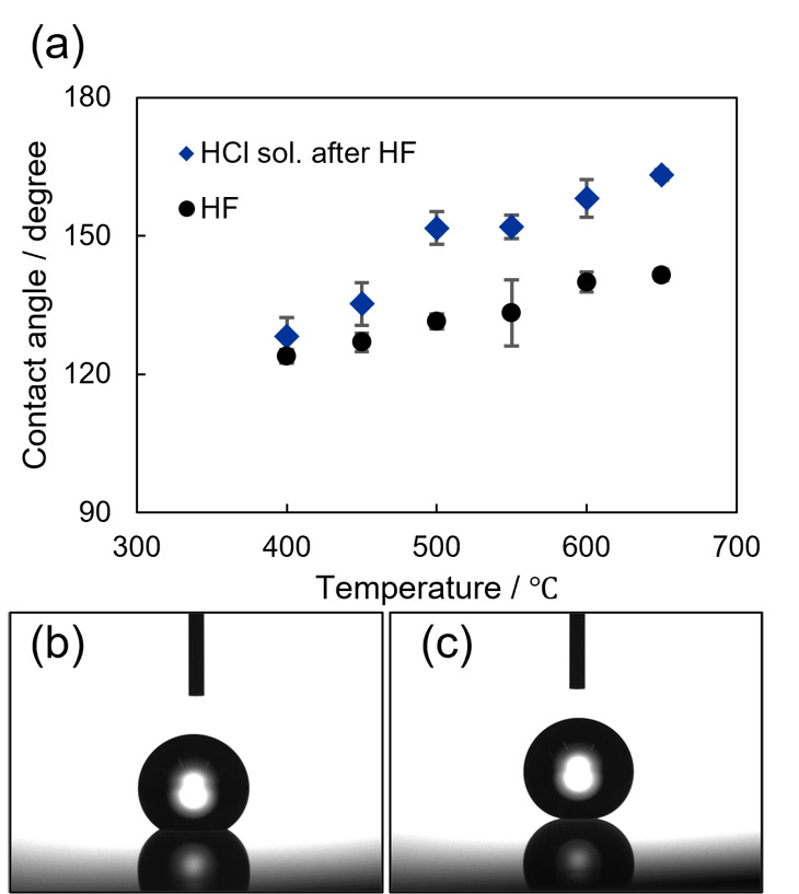Fig. 11(a)Water contact angle as a function of treatment temperature. The bottom images show representative droplets with contact angles of(b)143°on a substrate treated with HF alone at 650 ℃ , and(c)162°on a substrate treated with HF at 650 ℃ followed by hydrochloric acid cleaning.Fig. 12に各反応条件での塩酸処理後のサンプルの透過率の結果を示す。Ttheoretical maxは片面コートガラスの理論的な最大値であり、片面を無反射としたときの透過率である。これは次の式で導出した13。