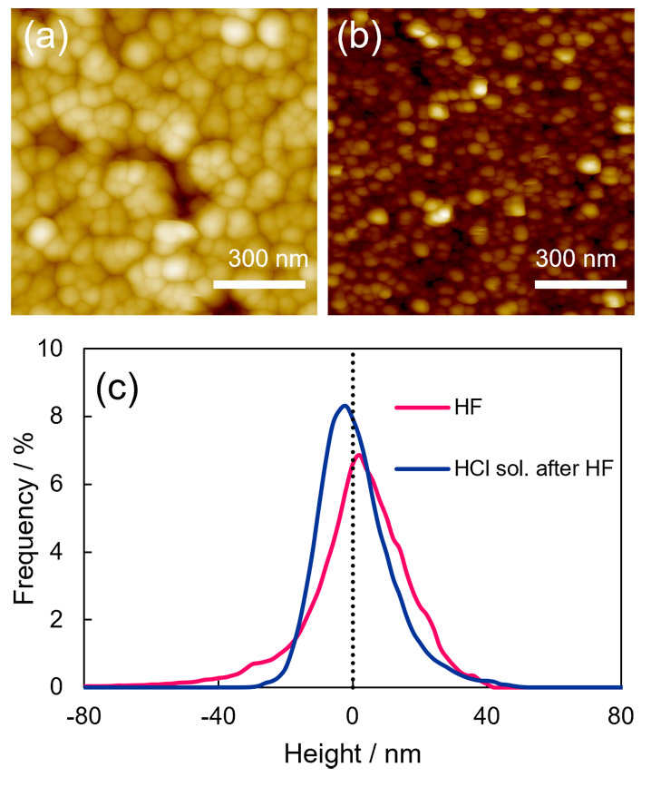 Fig. 6(c)にAFM観察像(Fig. 6(a)および(b))の高さヒストグラムを示す。平均高さを0とした。HF処理後に塩酸処理をした表面では高さが小さい点が多くの割合を占め、高さが大きい点は少数である。つまり、この表面では突起が疎に存在していることを示す。これはFig. 2に示したSEM像の結果と一致している。高い山が疎に存在している表面では山の頂点付近で水を支えることで固液接触面積比f を小さくすることができる。これらの形状の違いにより塩酸洗浄後の表面では固体と水の接触面積が小さくなり、f が低下することで撥水性が大きくなったと考えられる。
