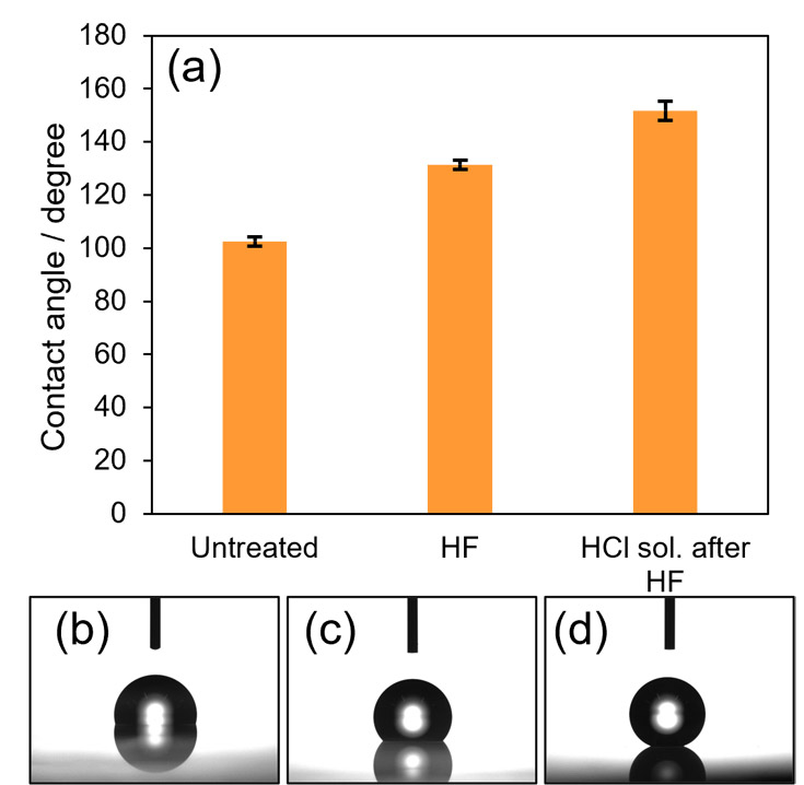 Fig. 7(a)Water contact angles measured on each substrate.(b–d)Images of water droplets on the surfaces of(b)the untreated substrate,(c)the HF-treated substrate, and(d)the substrate subjected to HF treatment followed by HCl cleaning and FAS-13 deposition.平坦面接触角103°の表面がWenzelの効果により 150°以上になるには、r が3.85以上になる必要がある。一方で固液界面に空気の層が存在すると接触角が向上することが知られている31。Cassie-Baxterモデルでは固液界面に固体と空気が混在する不均一表面の接触角を次式で説明している。