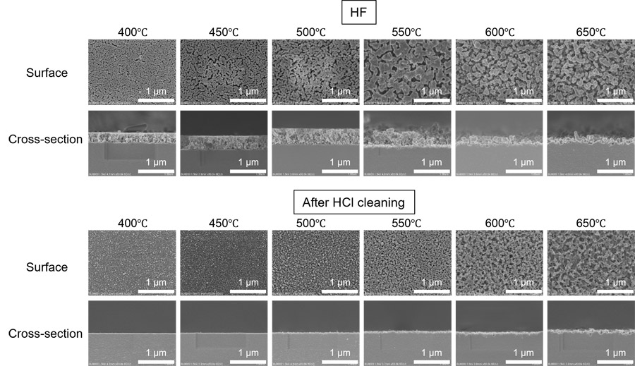 Fig. 8 SEM images of the substrates treated at various temperatures. The upper row shows substrates treated with HF, and the lower row shows those further cleaned with hydrochloric acid.