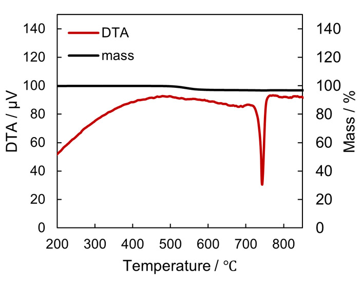 Fig. 9 Thermogravimetry–differential thermal analysis(TG-DTA)data for the fluoride formed at 500 ℃ .Fig. 8下段にはHF処理後に塩酸処理を行ったサンプルのSEM像を示す。処理温度を上げることで塩酸処理後の表面の凹凸のサイズが大きくなっている。