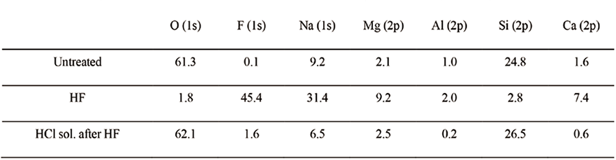 Fig. 2(a)(d)に未処理の基板,(b)(e)にHF処理した基板、(c)(f)にHF処理した後に10 %の塩酸で洗浄した基板の表面および断面SEM像を示す。HF処理は500 ℃ HF 5 %で4秒間行った。(b)(e)のHF処理したガラスでは表層500 nmの領域に多孔質の層が形成されている。Table 1にそれぞれの表面のXPSによる組成分析結果を示す。また、Fig. 3はHF処理した基板のXPSによる深さ分析結果である。HF処理されたガラスの表面は、シリコンと酸素が大きく減少し、ナトリウム、マグネシウム、カルシウム、フッ素が大幅に増加している。このことは酸化物のフッ素化反応が進行し、金属フッ化物が表面に残されることを示す。これらの反応を化学反応式で表すと次のように書ける。