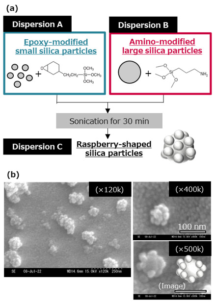 ラズベリー型シリカの作製は以下の手順で行った。オルガノシリカゾル「IPA-ST」(日産化学株式会社製、イソプロピルアルコール分散シリカゾル、SiO2: 30 %、粒子径:約12 nm)に10Mに希釈した2-(3、4-エポキシシクロヘキシル)エチルトリメトキシシランを加え、室温で30分攪拌することでエポキシ修飾シリカ粒子を含むシリカ分散液Aを得た。同様にして、オルガノシリカゾル「IPA-ST-L」(日産化学株式会社製イソプロピルアルコール分散シリカゾル、SiO2:30 %、粒子径:約50 nm)に10 Mに希釈した 3-アミノプロピルトリメトキシシランを加え、室温で30分攪拌することでアミノ修飾シリカ粒子を含むシリカ分散液Bを得た。シリカ分散液A、シリカ分散液 B、1-ペンタノールを混合し、30分超音波をかけることで、アミノ修飾シリカ粒子の表面にエポキシ修飾シリカ粒子が結合したシリカ複合粒子を含むシリカ複合粒子分散液Cを得た(Fig. 1(a))。