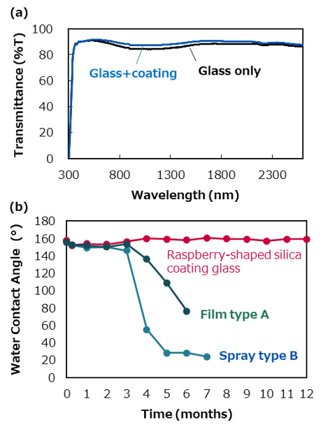 Fig. 10 (a) UV-vis to near-infrared spectra of raspberry-shaped silica coating glass. (b) Durability of long-term change in water contact angle in outdoor conditions.4. 総括