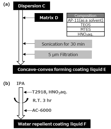 Fig. 2(a)Synthesis scheme for concave-convex forming coating liquid E.(b)Synthesis scheme for water repellent coating liquid F.2.1.3. 超撥水積層体の作製