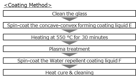 続いて、凹凸膜上に塗布する撥水液を作製した。イソプロピルアルコールに、トリメトキシ(1H、1H、 2H、2H-ノナフルオロヘキシル)シラン(東京化成工業株式会社製「T2918」)、硝酸を添加し室温で3時間攪拌した。この混合液とフッ素系溶剤(AGC株式会社製「アサヒクリンAC-6000」)を混合して、撥水コート液Fを得た(Fig. 2(b))。