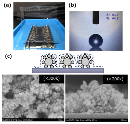 Fig. 4(a)The appearance and(b)water repellency of superhydrophobic film with raspberry-shaped particles.(c)The SEM images of top view and side view.3.2. ラズベリー型粒子の最適化