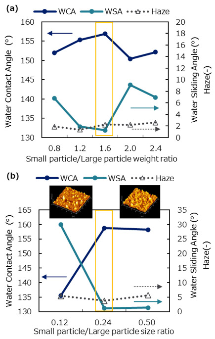 撥水性は表面のラフネス性によって変化するため、超撥水性能向上のためにラズベリー粒子を構成する大粒子と小粒子の割合の最適化を実施した。大粒子に対する小粒子の添加割合を0.8~2.4 wt%で変化させた際のサンプルの水接触角(WCA)、水転落角(WSA)、ヘーズをFig. 5(a)に示す。このとき、水接触角が最も高く、水転落角が最も低く性能良好であったのは、大粒子に対する小粒子の添加割合が1.6 wt%のときであった。小粒子が大粒子に対して1.6 wt%より少ないと、粒子をラズベリー化した際に凹凸が形成できていない箇所があり、小粒子が大粒子に対して1.6 wt%より多いと、余剰の小粒子が膜面の均一性を損ねてしまい性能が低下したと考えられる。また、小粒子が多いほど空気層の割合が増え、ヘーズが増加傾向であった。以上の結果より、大粒子に対する小粒子の添加割合を1.6 wt%として決定した。