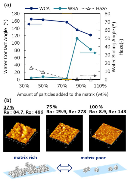 Fig. 6(a)Performance change with different addition ratios of particles and matrices.(b)AFM images at 37 %, 75 %, and 100 % particle addition ratio.3.3. ラズベリー型粒子を用いた超撥水膜の性能向上検討