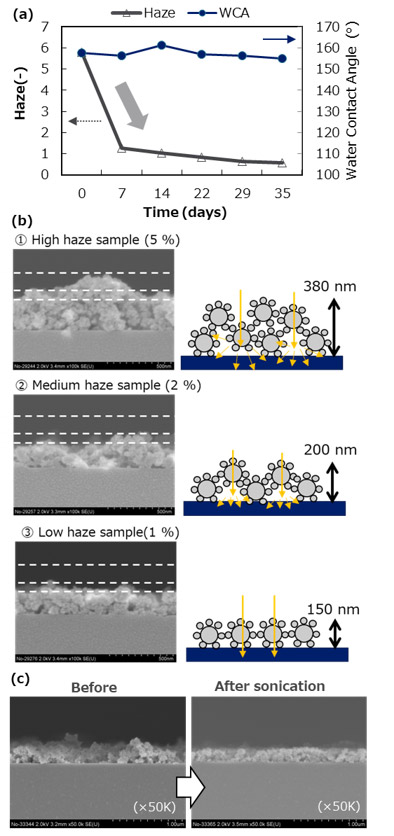 この経時でヘーズが低下する挙動は、超音波やホモジナイザーによる短時間のコート液の分散でも再現された(Fig. 7(c))。固形分濃度が比較的高く、粒子添加割合の高い本開発膜において、時間経過や超音波等の処理によりコート液内の粒子の分散が進んだ結果、製膜した際に基材との密着性や膜密度が向上し、空隙での乱反射が抑えられ、低ヘーズ化したものと考えられる。