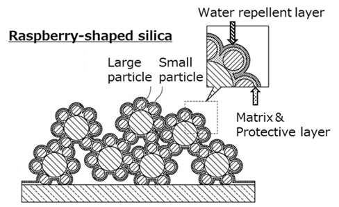 ラズベリー型シリカとC4フッ素系撥水膜を使用した超撥水開発膜の撥油性能においては、ヘキサデカンの接触角は110°~120°であり、撥油性能も確認できた。また、本開発膜をコーティングした10 cm角ガラスにJIS試験用粉体1の8種(一般社団法人日本粉体工業技術協会製)1.0 gを振りかけた後のヘーズ増分は、コーティングなしでは2.11であったのに対し、開発膜では0.15となっており、砂に対する防汚性能が確認できる結果となった。