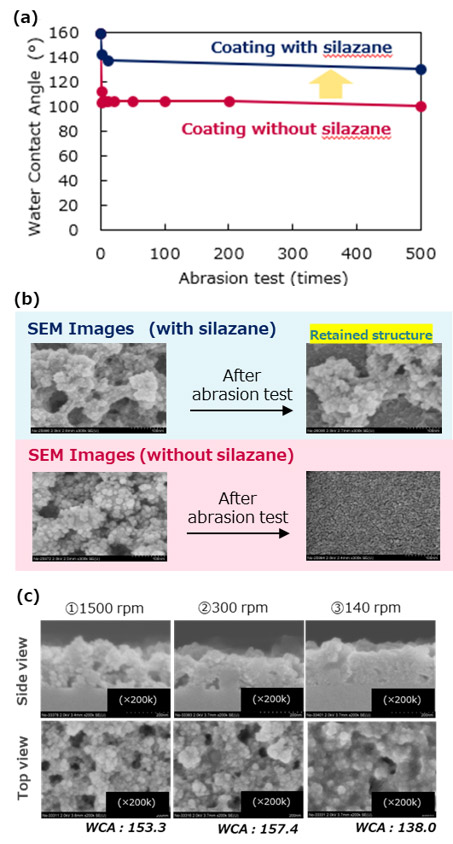 Fig. 9(a)Abrasion resistance test results with and without silazane.(b)SEM images before and after abrasion resistance test.(c)Difference in pore structure depending on the amount of silazane.3.3.3. 撥水膜の非フッ素組成化検討