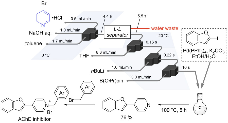 このようにして得られたボリル化されたピリジンは、カップリング反応を通じて機能性分子へ展開することが可能である。先に構築したワンフロー反応系で得られた反応混合物に対して、クエンチ等の処理を行うことなくカップリング反応の試薬を添加したところ、AChE阻害活性物質(15)の前駆体が良好な収率で得られることが確認された(Fig. 14)。