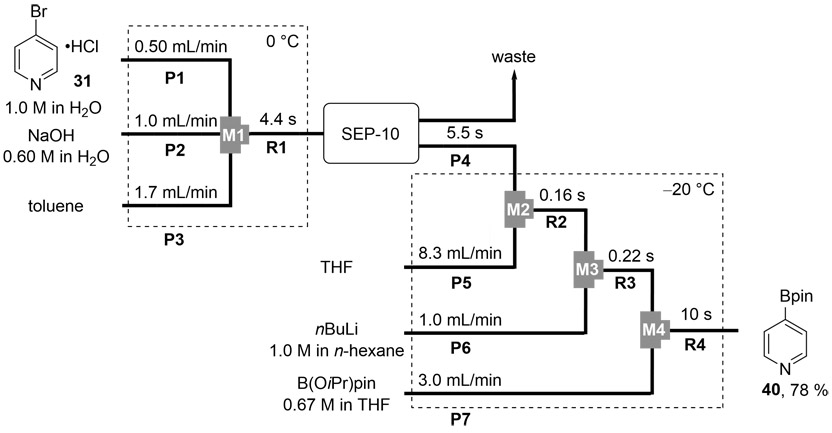 三方マイクロミキサー(M1、φ =500 μm)、T字型マイクロミキサー3つ(M2–M4、φ =500 μm)、マイクロチューブリアクター4つ(R1–R4)、および7つの予冷ユニット(P1–P7)、Zaiput社製のSEP-10フロー液液分離装置(疎水性PTFE分離膜OB-900を使用)からなるフローマイクロリアクターシステムを用いた。SEP-10より前のフローマイクロリアクターは0℃の冷却浴に浸し、後のフローマイクロリアクターは-20 ℃の冷却浴に浸した。4-ブロモピリジン塩酸塩の水溶液(1.0 M、流速:0.50 mL/min)と、水酸化ナトリウム水溶液(0.60 M、流速:1.0 mL/min)と、トルエン(流速:1.7 mL/min)は、シリンジポンプを用いてM1に導入され、その混合溶液はR1(L R1= 30cm、t R1= 4.4 s)を通過して、SEP-10に到達した。SEP-10により水層と有機層が分離され、有機層はP4を通過した後にTHF(流速:8.3 mL/min)とミキサーM2で混合された。混合溶液はR2(L R2= 3.5 cm、t R2= 0.16 s)を通過して、M3でノルマルブチルリチウム(ノルマルヘキサン中1.0 M、流速:1.0 mL/min)の溶液と混合された。混合溶液はR3(L R3= 3.5 cm、t R3= 0.22 s)を通過して、M4でイソプロポキシボロン酸ピナコールエステル(THF中0.67 M、流速:3.0mL/min)の溶液と混合され、反応溶液はR4(L R4=100 cm、t R4= 10 s)を通過した。定常状態に達した後、反応混合物の一部を回収し、飽和塩化アンモニウム水溶液で処理した。この反応混合物について内部標準物質を用いてガスクロマトグラフィーにより分析したところ、目的の4-(4,4,5,5-テトラメチル-1,3,2-ジオキサボラン-2-イル)ピリジン(40)が収率78 %で得られたことが確認された。