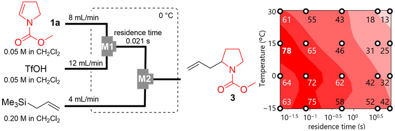 環状エナミン1aをモデル基質として、カルボカチオンの発生条件を検討した(Fig. 5)。ここでは、この基質に対するトリフルオロメタンスルホン酸による活性化と、その後のアリルトリメチルシランへの求電子反応により得られる付加体3の収率を調査した。まず、バッチ法において試薬の添加順や反応温度を変化させながら合成を試みた結果、目的物の収率は低く、最大でも40 %台に留まった。