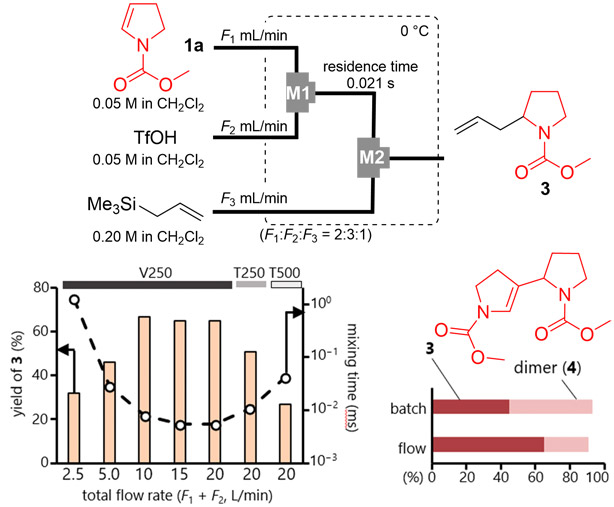Fig. 7 Effects of Mixing Efficiency in Flow.に示す結果から、全体の流速が増加するにつれて混合時間が短縮され、それに伴い目的物の収率が向上する傾向が認められた。さらに、流速を一定に保ちながらミキサーの形状 を変更すると、混合時間が長くなるミキサーを使用したの場合、収率が低下することが明らかとなった。また、この反応における主な副生物はダイマー4であることが確認された。バッチ法とフロー法それぞれで最も高収率が得られた条件下で比較したところ、フロー法の方がダイマーの生成を抑えられるために目的物の収率が向上したと示唆された。これらの結果は、エナミン1aとトリフルオロメタンスルホン酸の混合効率を向上させることで、効率的な活性種の発生が可能になることを示唆している。