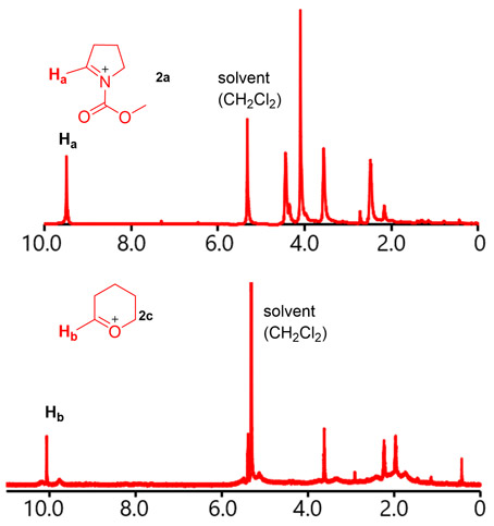 トリフルオロメタンスルホン酸による活性化で生成する活性種について知見を得るため、フロー法を用いてエナミンを活性化した反応混合物の低温NMR測定を-78 ℃で実施した。Fig. 8に示すように、6.5 ppm付近に特徴的なピークを有する原料のシグナルは完全に消失し、9.5 ppm付近に特徴的なピークを有するカルボカチオン2aが不可逆的に生成していることが確認された。さらに、類似する構造をもつ環状エノールエーテルを用いて同様の測定を行ったところ、オリゴマー副生物由来と思われるピークを伴いながらカルボカチオン2bの生成が確認された。これらの結果から、フロー法により高速かつ不可逆的にカルボカチオンを発生させる手法が開発された。