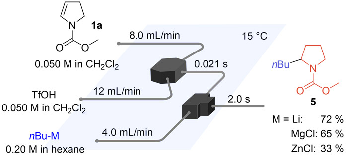V字型マイクロミキサー(M1、φ =250 μm)、T字型マイクロミキサー2つ(M2とM3、φ =250 μm)、マイクロチューブリアクター3つ(R1–R3)、および4つの予冷ユニット(P1–P4)からなるフローマイクロリアクターシステムを用いた。フローマイクロリアクターは-10 ℃の冷却浴に浸した。カチオン前駆体(1-メチルピロリジン-2-カルボン酸メチル(1a)、CH2Cl2中0.0500 M、流速:6.7 mL/min)の溶液とトリフルオロメタンスルホン酸(CH2Cl2中0.0500 M、流速:13.3 mL/min)の溶液は、シリンジポンプを用いてM1に導入され、その混合溶液はR1(L R1= 12.5cm、t R1= 0.29 s)を通過して、M3に到達した。一方、4-ブロモベンゾトリフルオリド(THF中0.180 M、流速:10 mL/min)の溶液とノルマルブチルリチウム(ノルマルヘキサン中0.60 M、流量:2.5 mL/min)の溶液はシリンジポンプを用いてM2に導入され、混合溶液はR2(L R2= 100 cm、t R2= 3.8 s)を通過して、M3に到達した。これらの溶液はM3で混合され、反応溶液はR3(L R3= 100 cm、t R3= 1.4 s)を通過した。定常状態に達した後、反応混合物の一部を回収し、飽和塩化ナトリウム水溶液で処理した。この反応混合物について内部標準物質を用いてガスクロマトグラフィーにより分析したところ、目的のメチル2-(4-トリフルオロメチルフェニル)ピロリジン-1-カルボキシレート(6)が収率89 %で得られたことが確認された。